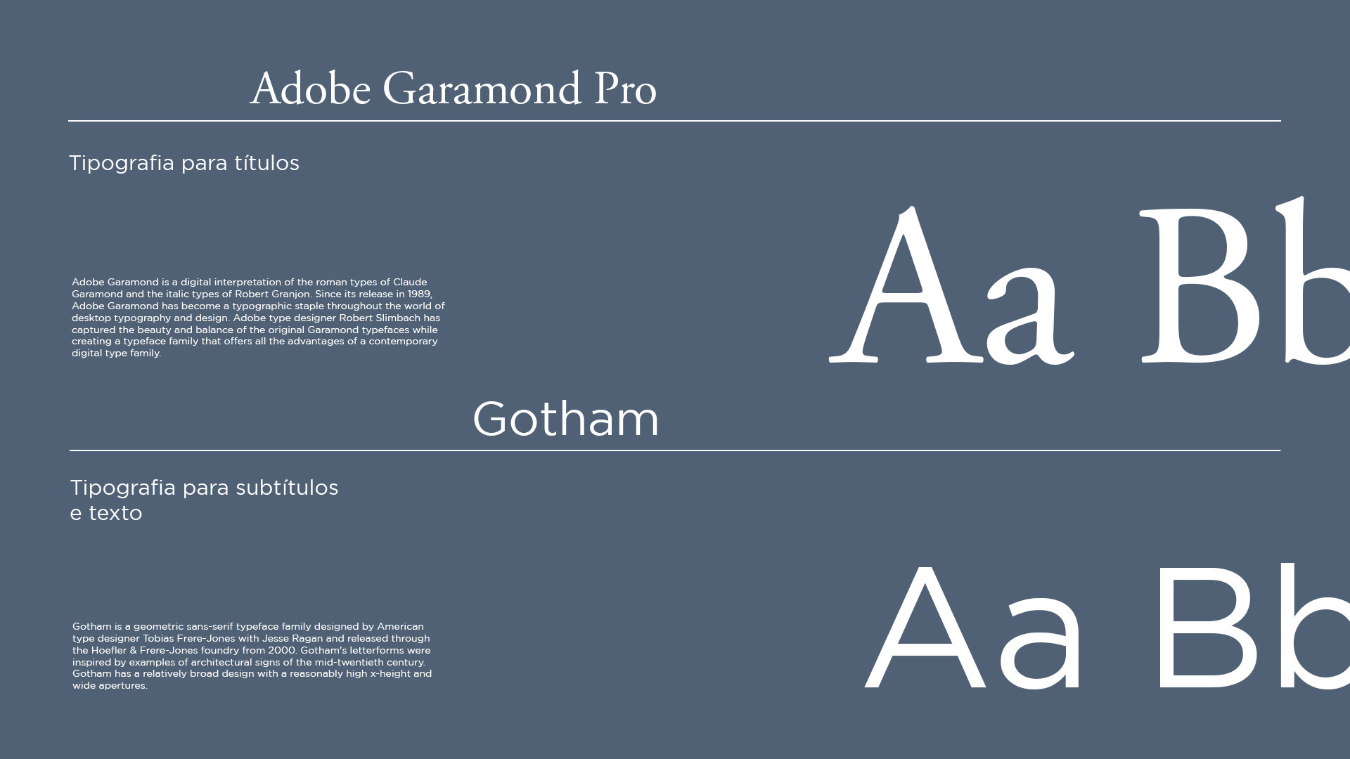 As tipografias trouxemos o ar de sabedoria provinda da experiência do profissional com a Garamond como tipografia de títulos e a Gotham para os subtítulos e textos menores.