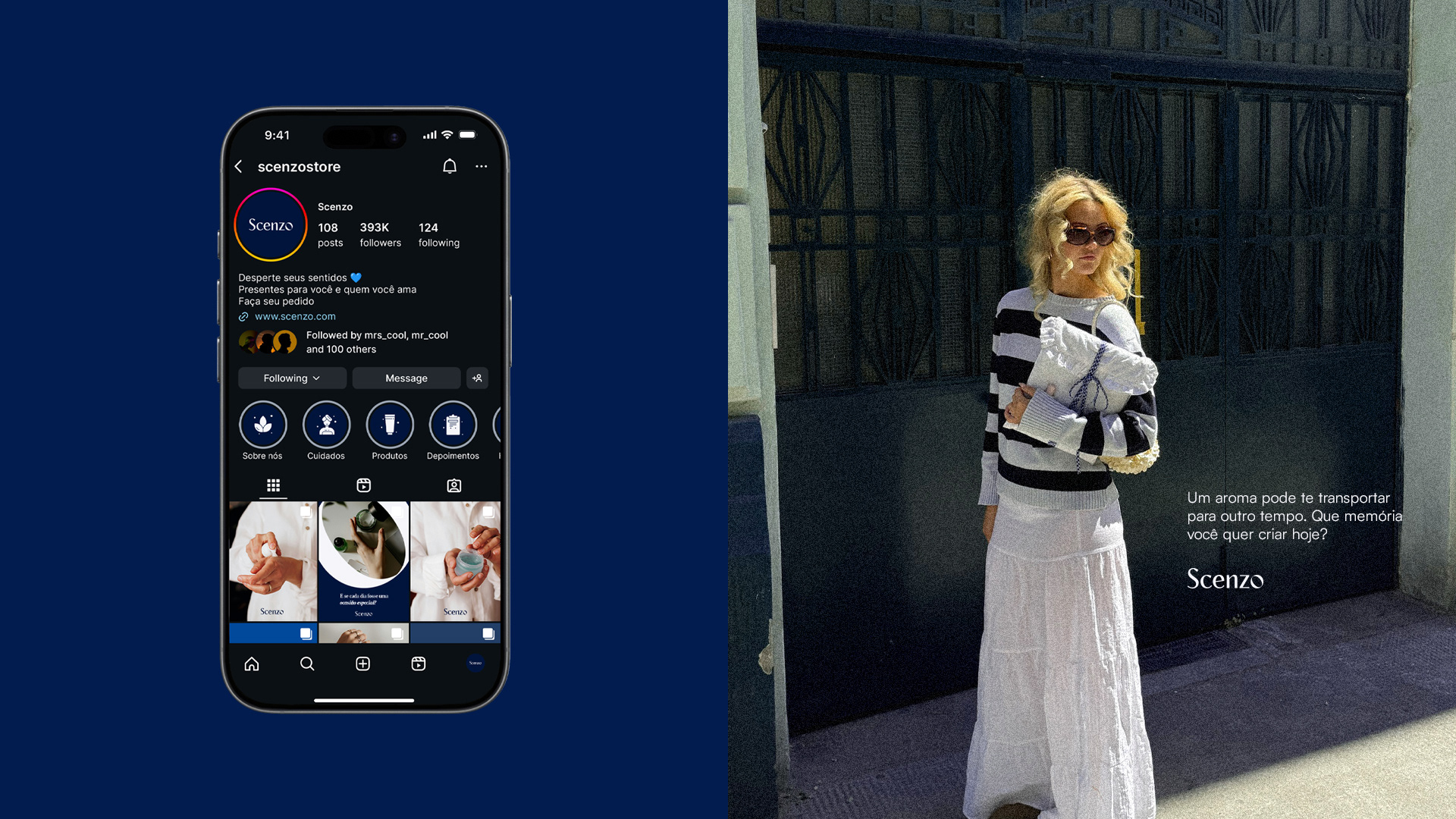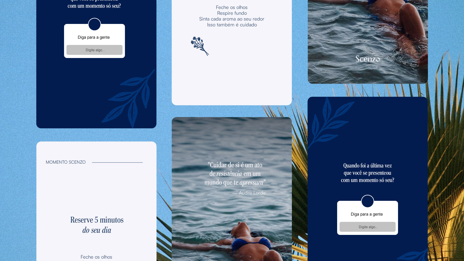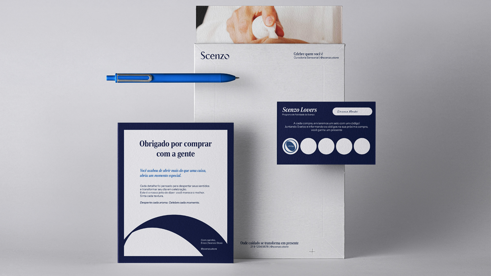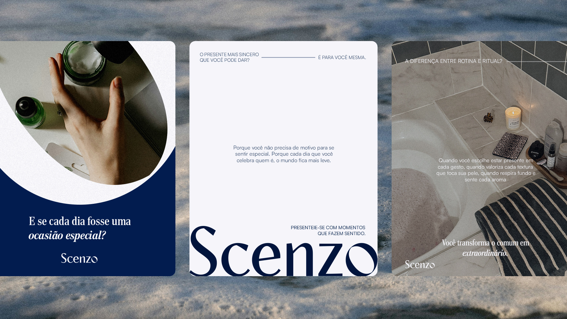 Scenzo transforms self-care into celebration through sensorial brand identity. Balancing sophistication with warmth, the visual system centered on "where care becomes a gift" creates accessible luxury for middle-class consumers. From elegant typography to gift-inspired stripe patterns, every element elevates everyday rituals into special moments. Services: Brand Strategy, Naming, Visual Identity, Art Direction, Social Media Guidelines _____ Scenzo transforma autocuidado em celebração através de identidade visual sensorial. Equilibrando sofisticação com acolhimento, o sistema visual centrado em "onde cuidado se transforma em presente" cria luxo acessível. Da tipografia elegante aos padrões de listras inspirados em presentes, cada elemento eleva rituais cotidianos em momentos especiais. Serviços: Estratégia de Marca, Naming, Identidade Visual, Direção de Arte, Diretrizes para Redes Sociais.